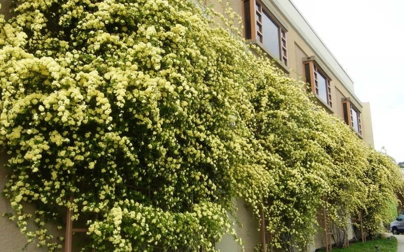 The Lady Banks Rose is exceptionally easy to grow in most any moist but well-drained soil of average or above average fertility and full sun to part shade. As with all other roses, morning sun is a must to dry dew from the leaves but some afternoon shade or filtered sun is okay. Flowering will be best if the plant receives at least 6 hours of direct sun during the day. Has very good drought tolerance and disease resistance. We think this rose is more beautiful when allowed space to grow naturally, with little if any pruning. That said, she responds well to pruning. With regular pruning a Lady Banks Rose can be kept full and bushy.Â